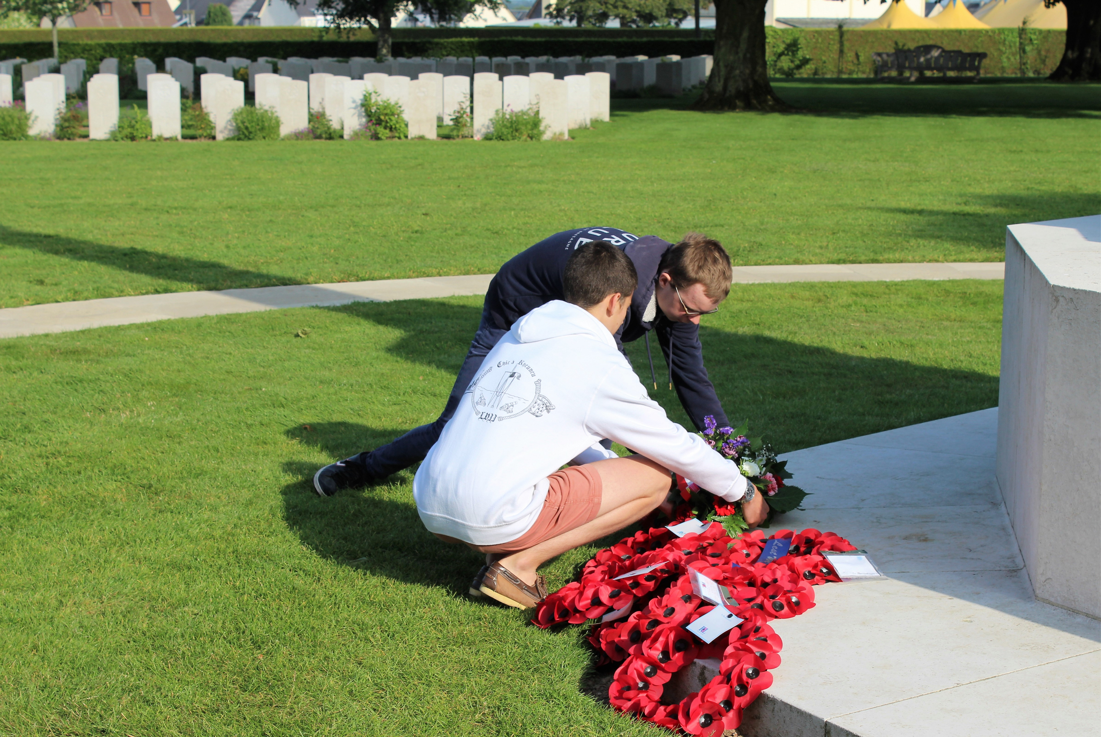Dépôt de gerbe effectué par Valentin et Paul, un autre lauréat, au cimetière militaire britannique de Bayeux |