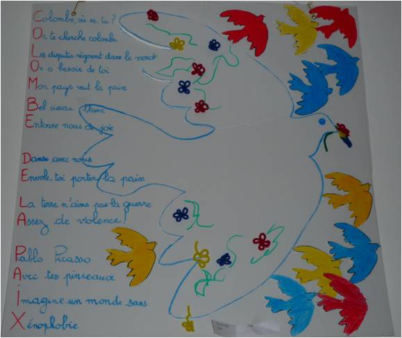 La Colombe de la paix (dessin et acrostiche d’écoliers) |